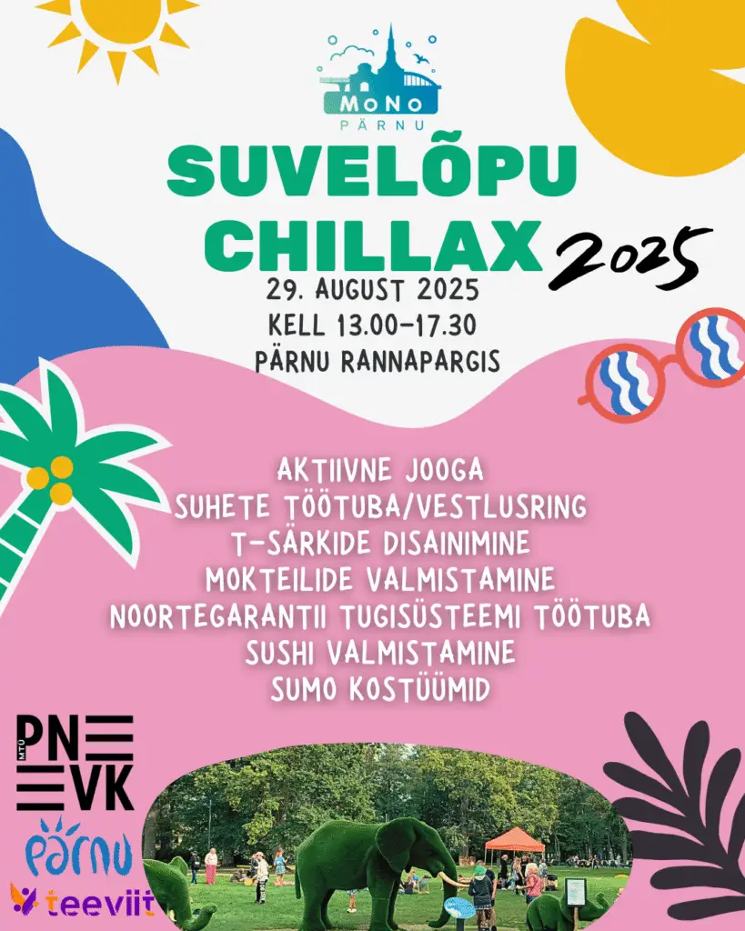 Suvelõpu Chillax on Pärnu MoNo mobiilsete noorsootöötajate poolt ellu kutsutud traditsiooniline kogukonnasündmus, mis toimub kuuendat aastat järjest augustikuu viimasel reedel. Ootame kõiki 29. augustil algusega kell 13.00 Rannaparki, roheliste elevantide juurde. Sündmuse eesmärk on pakkuda noortele mõtestatud, arendavat ja samas ka meelelahutuslikku vaba aja veetmise võimalust täiskasvanute hoole all. Kõik tegevused on tasuta ja registreerimine […]